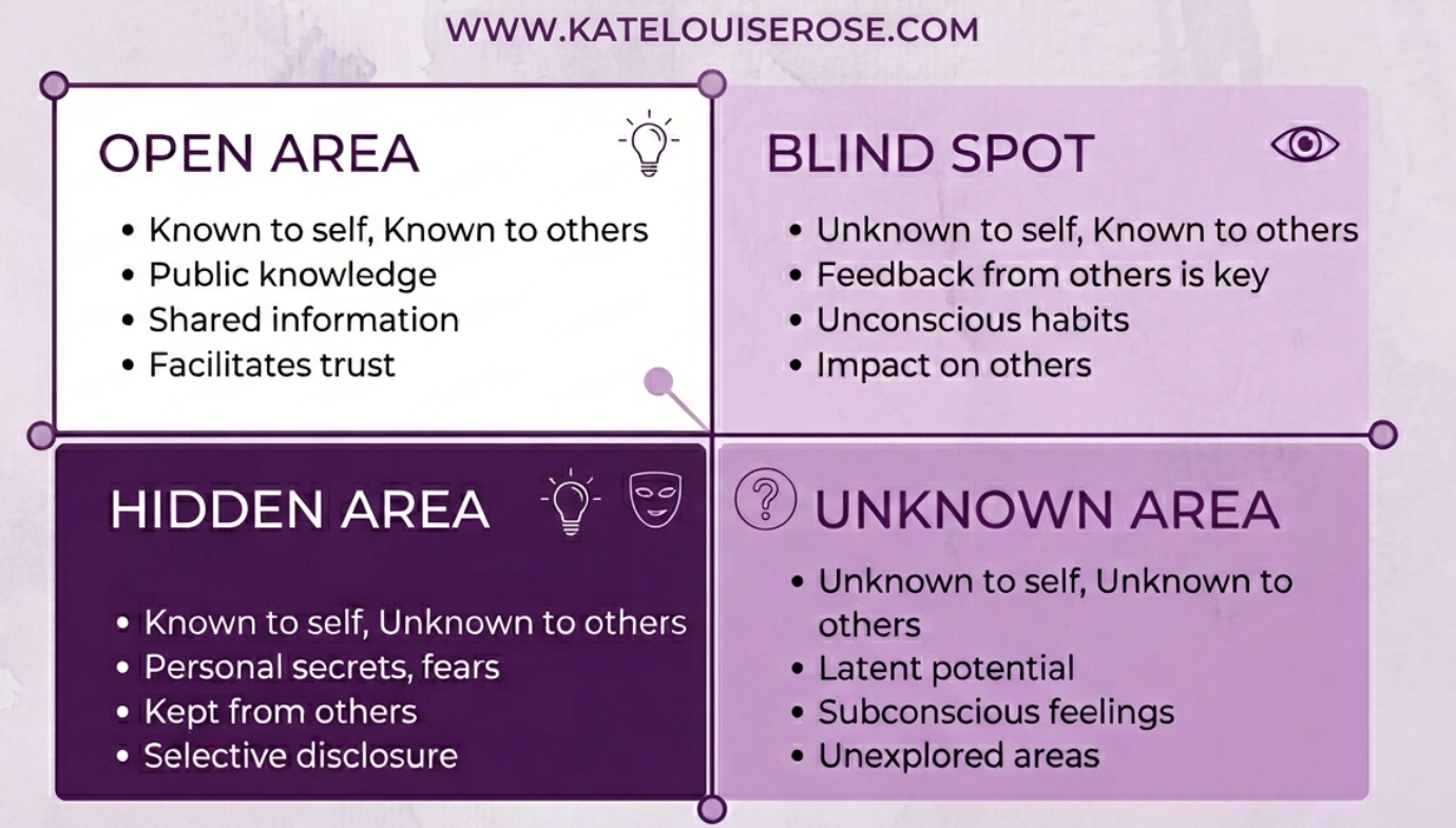 I first encountered the Johari Window through my tutors, Ali and Barbara, at the Inter Psyche Training Institute. As a naturally confident, vocal woman, my window was always wide open. But I soon realised that effective communication isn’t just about being an open book; it’s about the art of tailoring your openness to the person standing in front of you.